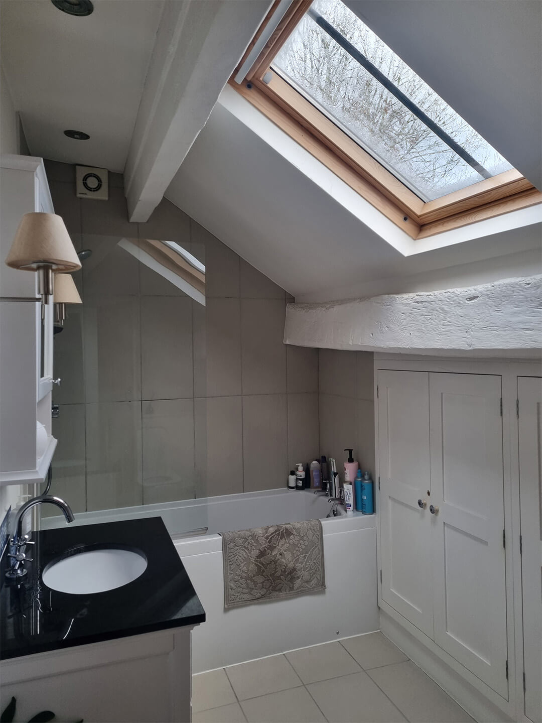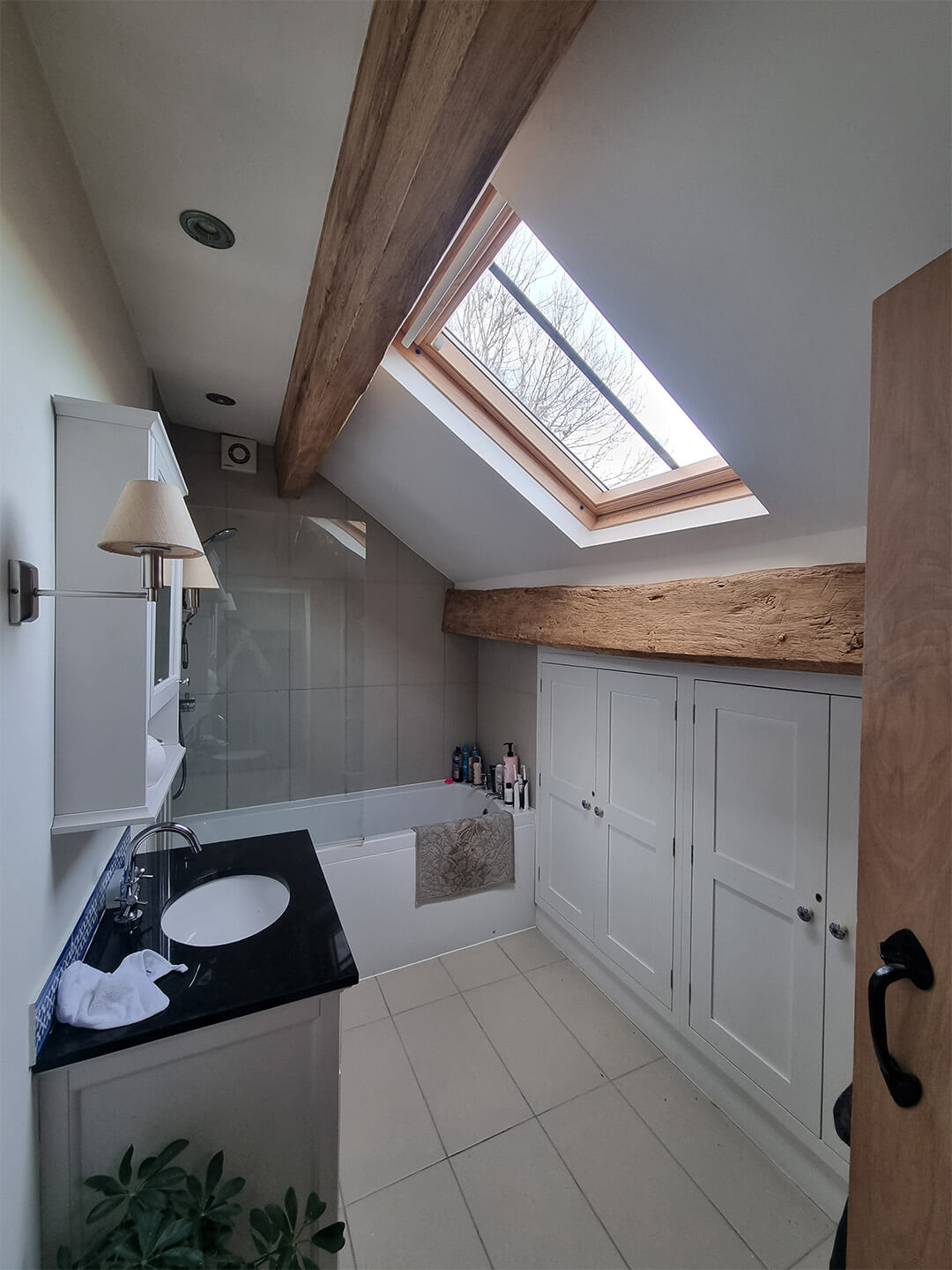 Once painted white and concealed within the ceiling, the original wooden beams have now been carefully restored and finished in a light Antique Oak finish. This treatment enhances the natural grain and character of the wood. Allowing the beams to become a visible architectural feature rather than a hidden structural element.